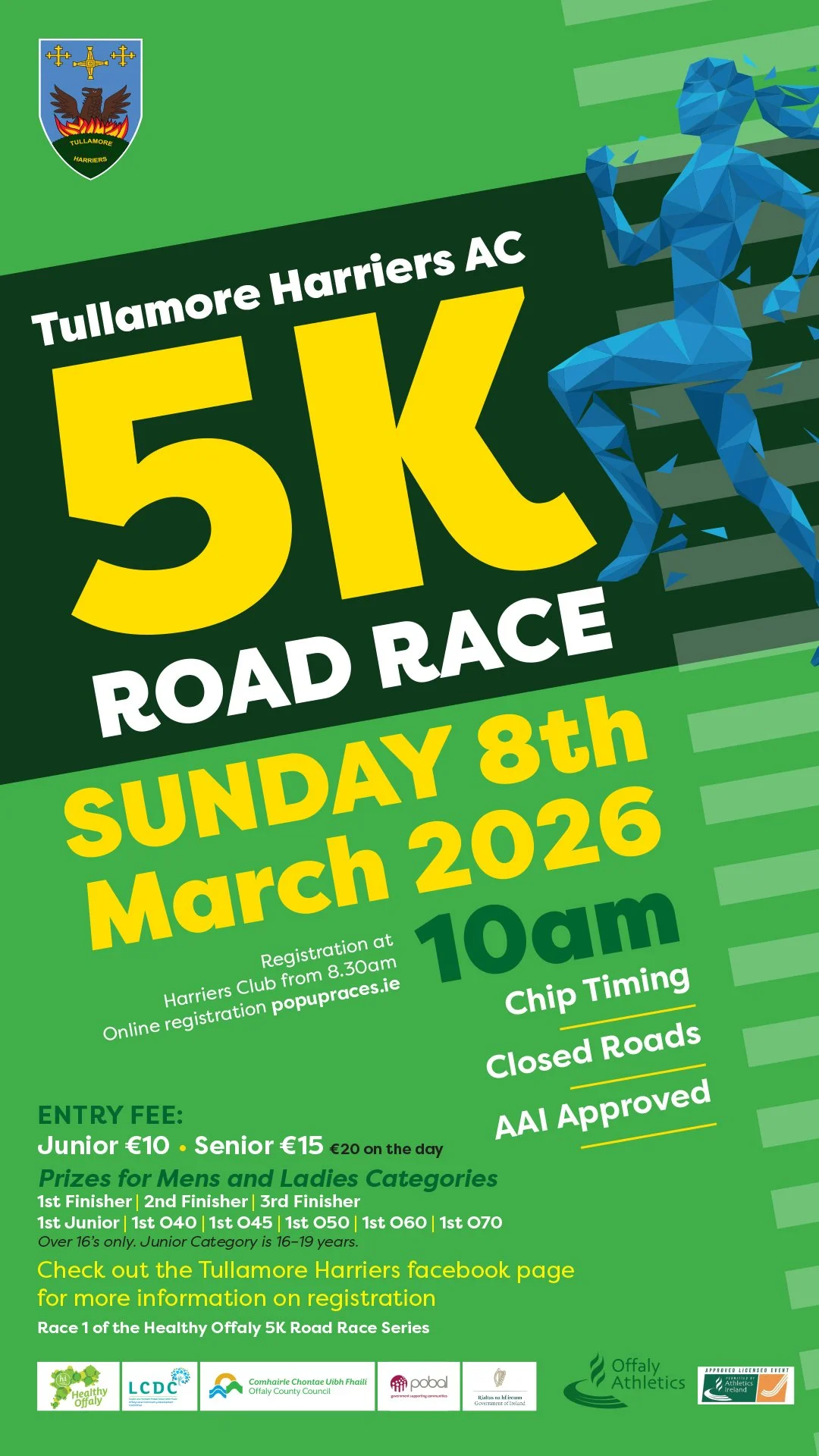 This race is Race 1 of the 2026 Healthy Offaly 5K Series, with age-group prizes and valuable series points up for grabs.